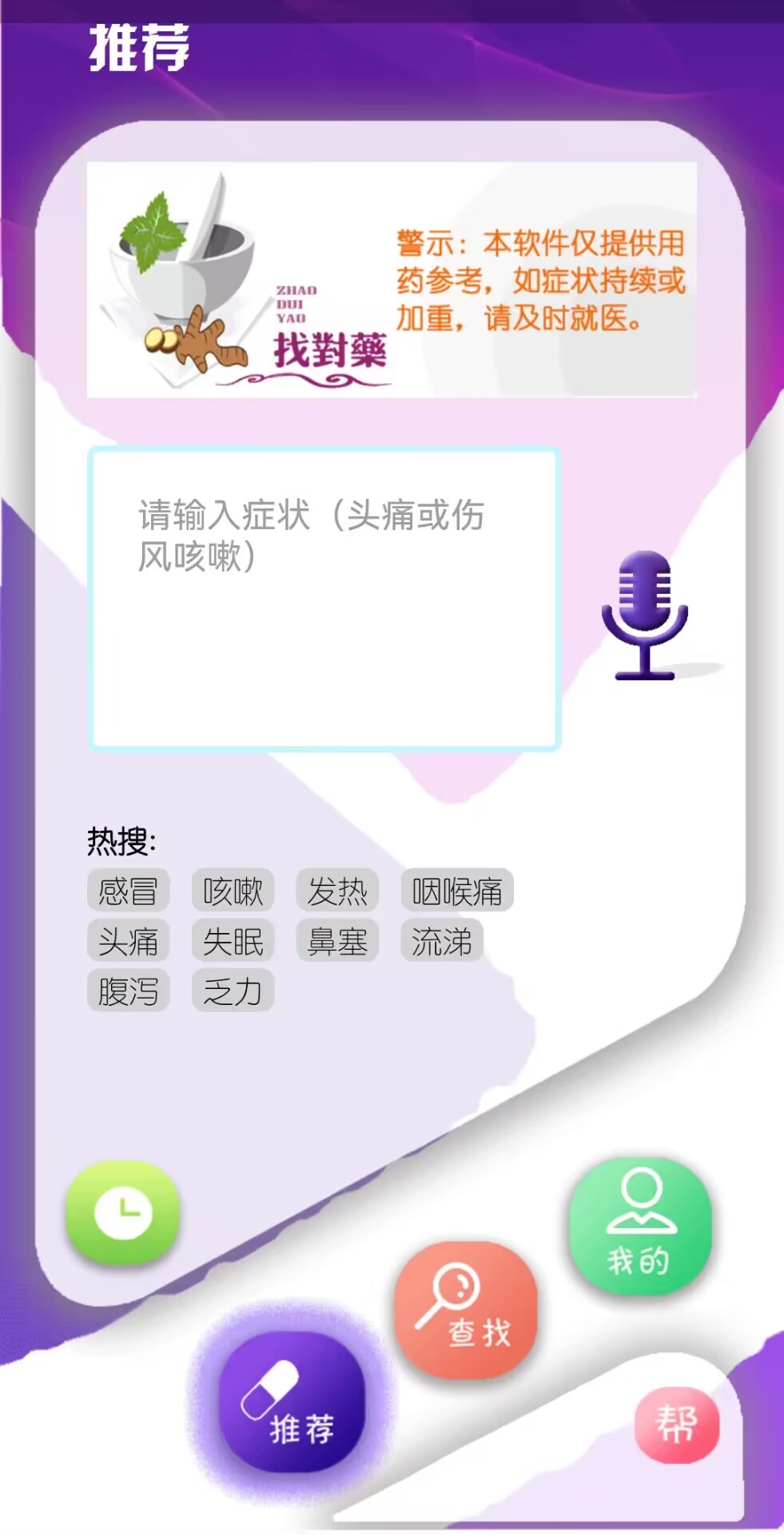 运用海量非处方中成药知识库与智能运算,为用户提供常见病的非处方中成药推荐服务。